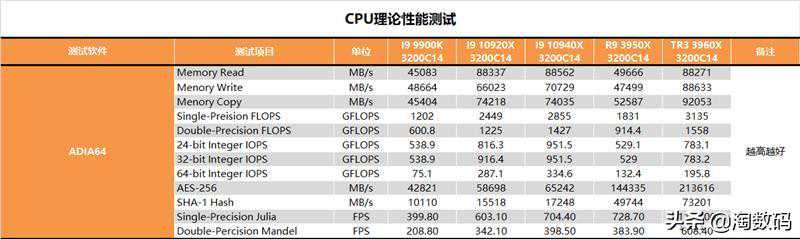 CPU理论性能测试,是用AIDA64的内置工具进行的,TR33960X的理论性能非常恐怖,达到了i9-9900K的3.28倍。