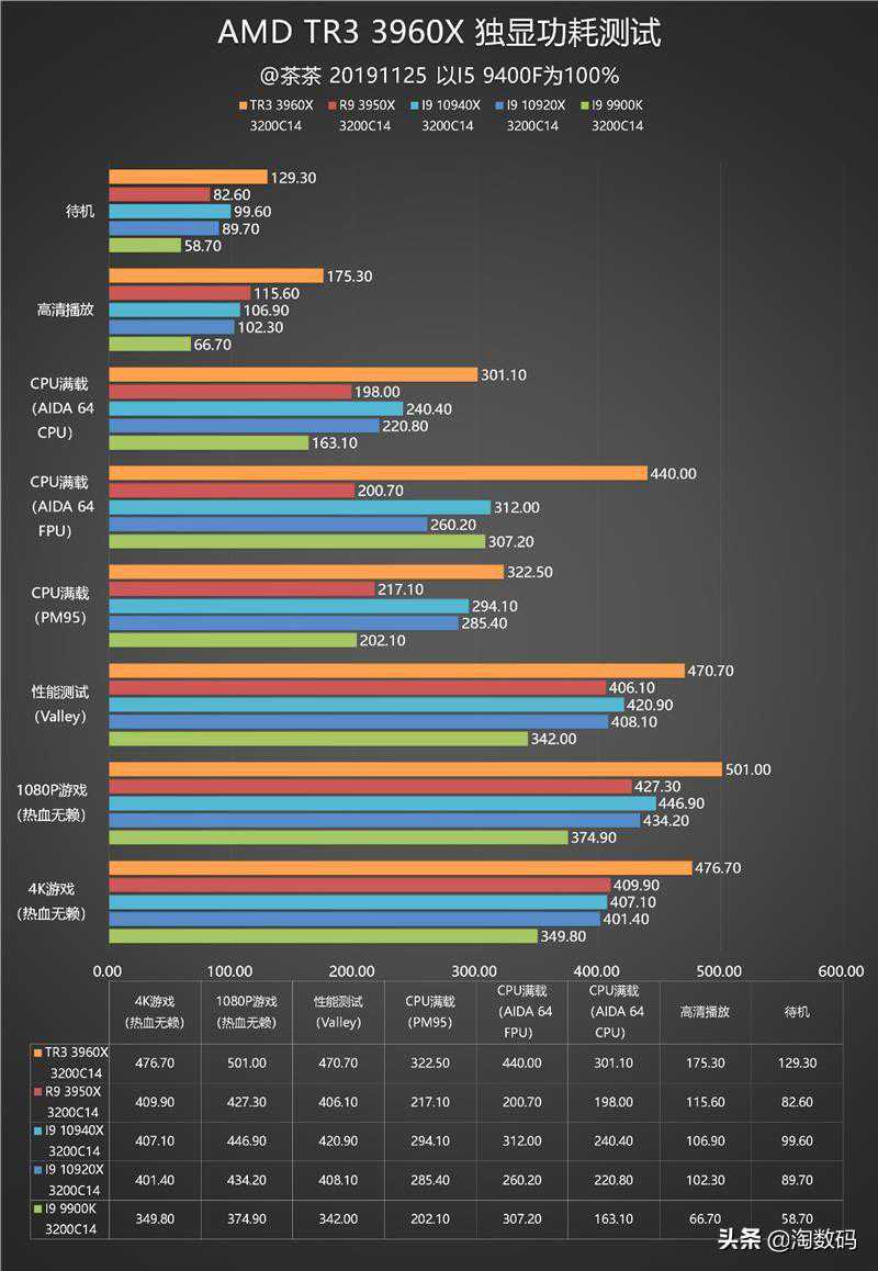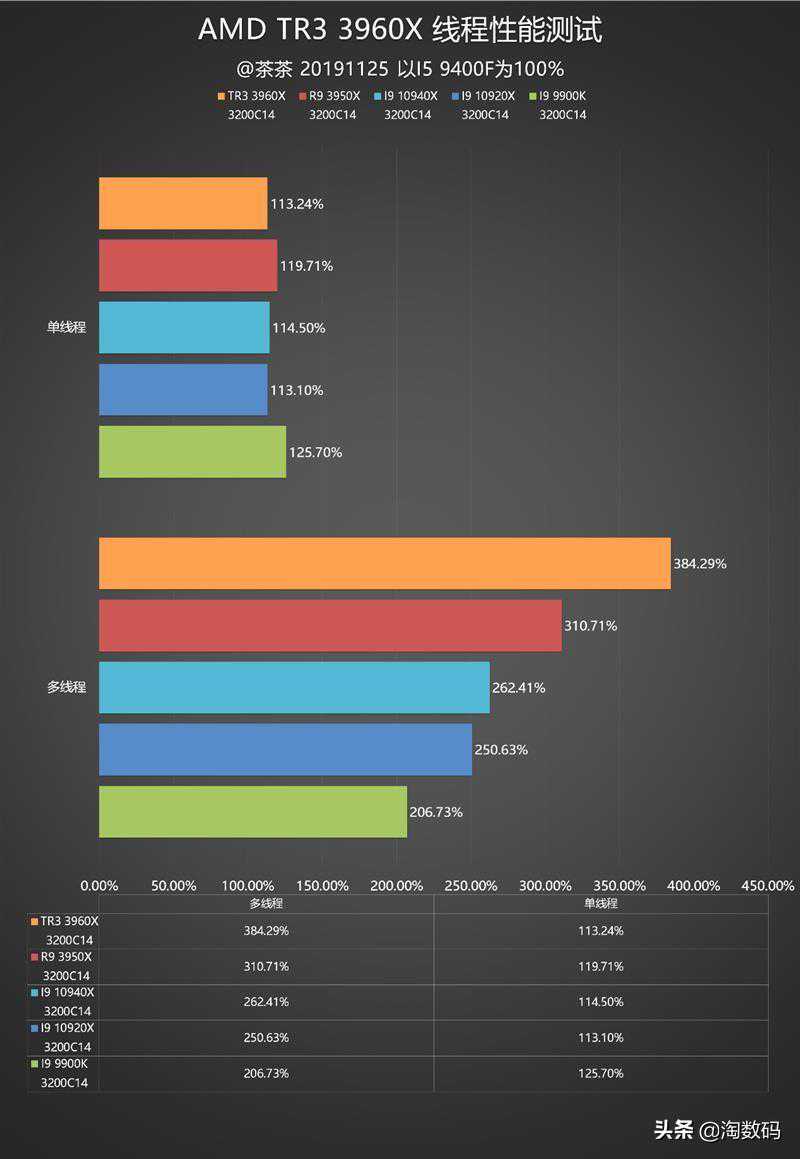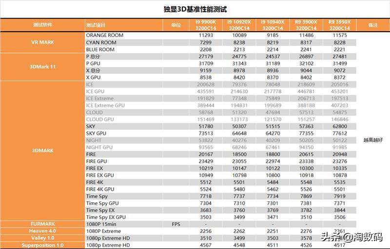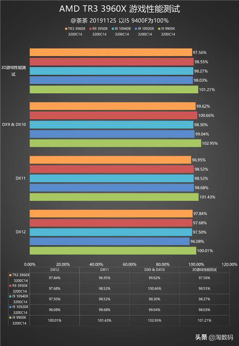 这次的测试对比组是R93950X、i9-10940X、I910920X、i9-9900K。对比100%标杆依然是I59400F,因为篇幅关系没有放在表格中。