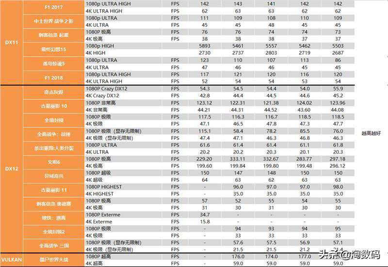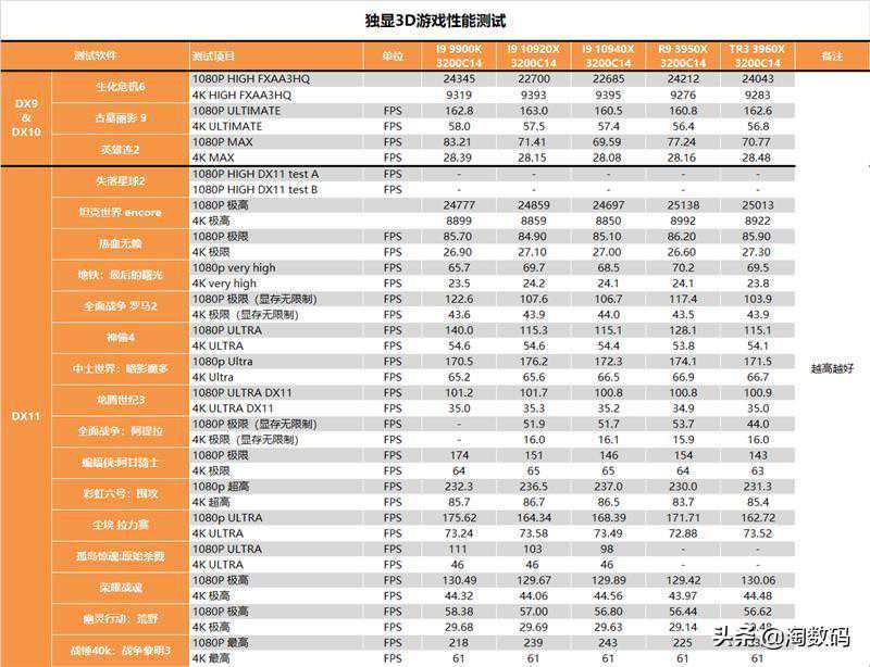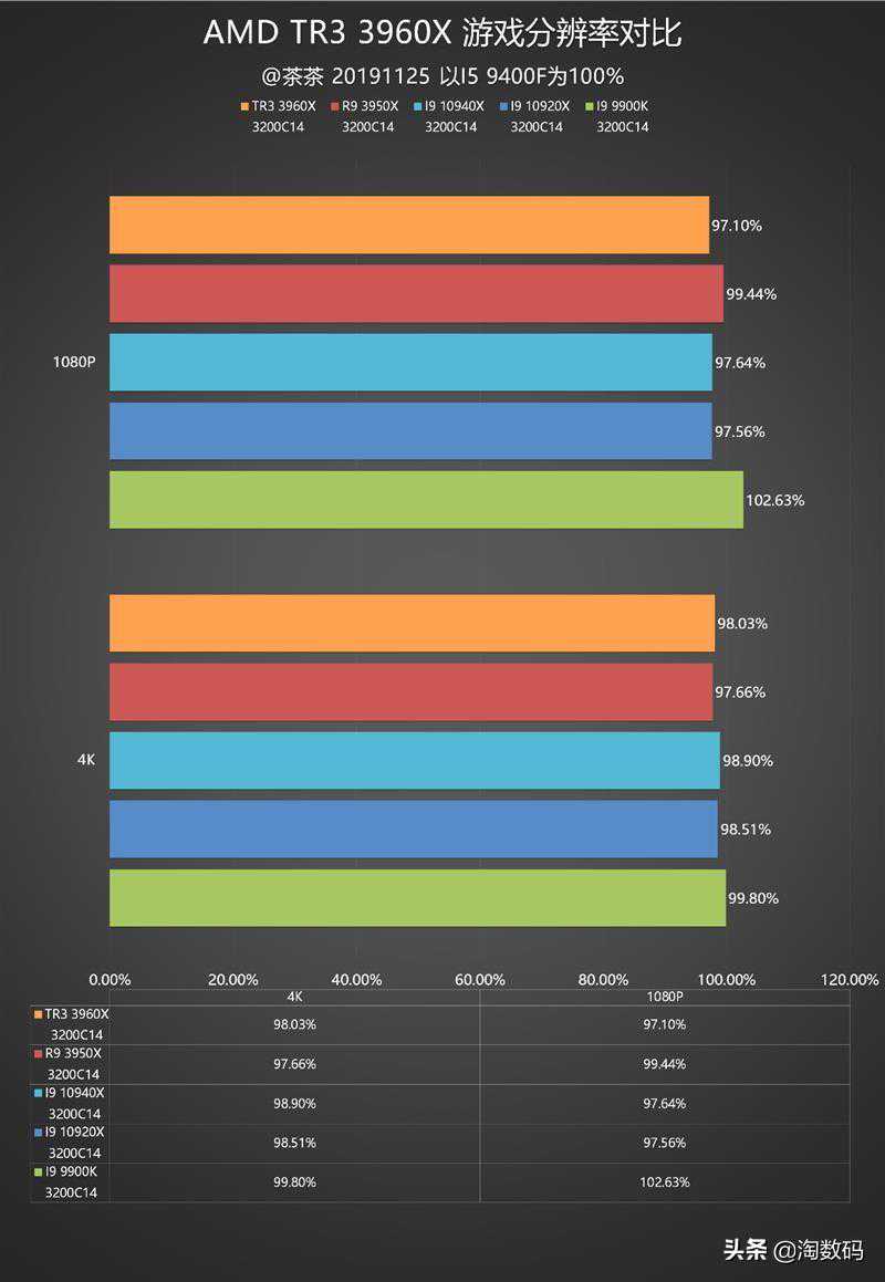 游戏测试中历来会带来很大的争议就是关于分辨率,所以这里就直接拆开统计。TR33960X在4K下的表现会更好一些。
