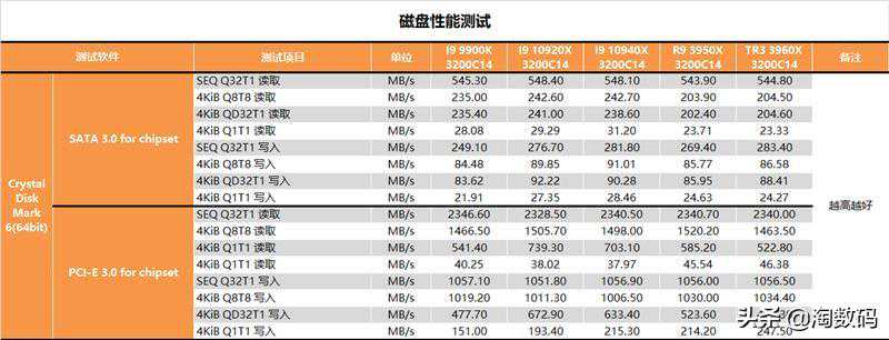 磁盘测试部分用的是CrystalDiskMark6,1G的数据文件跑9次,这样基本可以排除测试误差。测试的SSD分别是535480G和750400G,都是挂从盘。简单科普一下这个测试里的概念,SATA接口和PCI-E通道都是可以从CPU或芯片组引出的(看CPU厂商怎么设计)。这边为了统一,测试的都是芯片组引出的SATA和PCI-E。