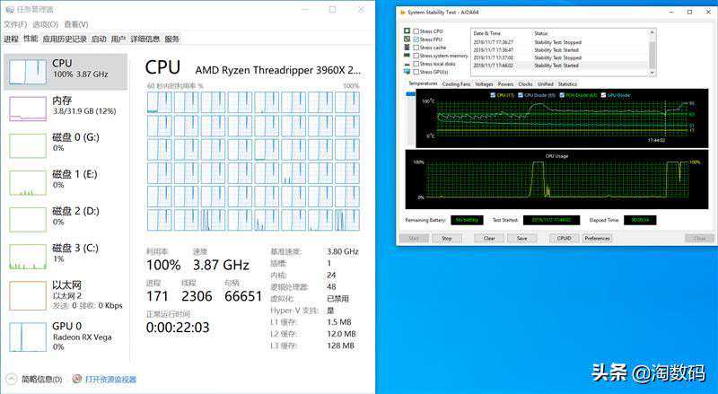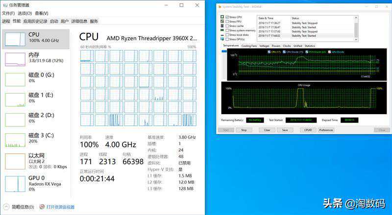 功耗测试只做了搭配独显的平台测试,TR33960X显然是不跟你讲能耗比的产品,往上怼就完事了。所以有条件的话,做分体式水冷是比较好的压制方式。