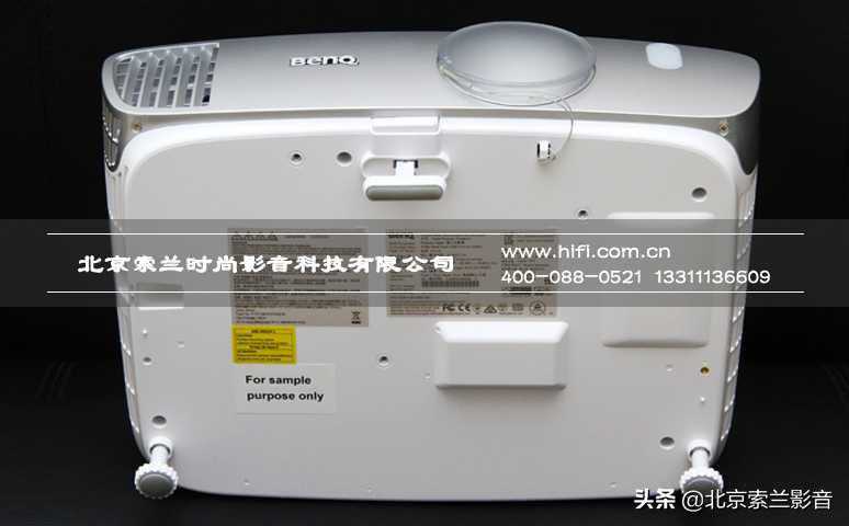 明基W1110机身底部W2000机种基本一样,包括了活动脚、吊装孔、产品标签和警示信息。不过相比以往机型,明基特增加了一个活动支脚,通过前支架,加上后两部支脚,为摆放使用时提供了大幅度调整范围,大大提升了产品的易用性。
