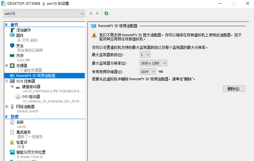 添加完成之后,重新打开hyper-v管理器,设置虚拟机菜单中就出现remotefx3d显示适配器了。