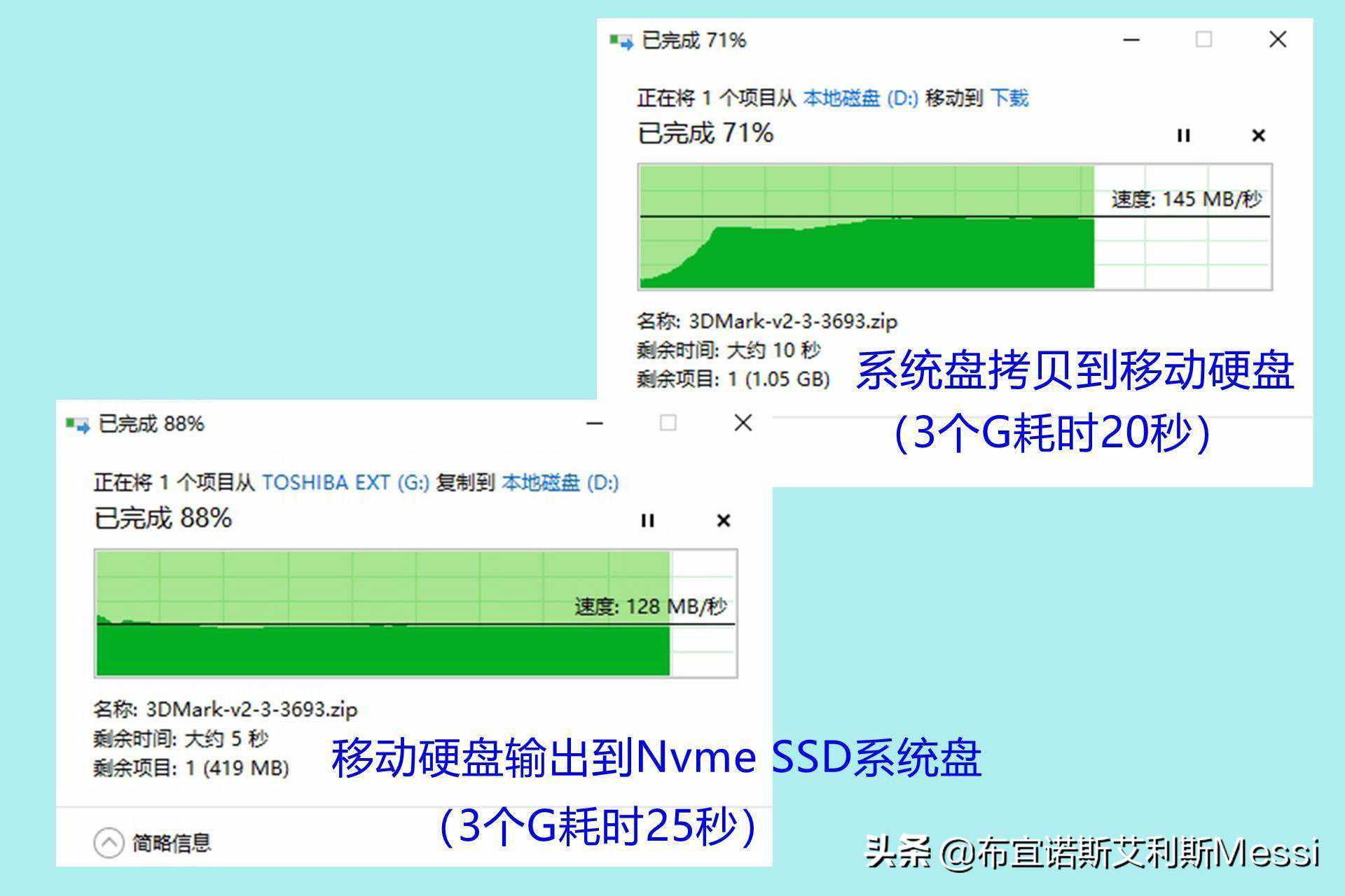实测文件读取始终稳定在125MB/S以上,写入更是达到了145MB/S,3个G的文件,只需20秒即可传输完毕,比U盘和我的老硬盘要快上很多。