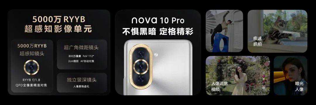 传承华为影像强大的影像实力,华为nova10系列后置搭载超感知影像单元,配备5000万RYYB超感知影像镜头、800万超广角微距镜头和人像虚化景深镜头,并配备了华为旗舰级RYYB超感光滤色阵列,有效提升暗光拍摄的影像性能,带来超越人眼感知的暗部细节表现。配合AI质感肤质算法以及像素级重构技术,在不同光线条件下都呈现明亮的面部细节;得益于QPD全像素精准对焦和零延迟快门技术(ZSL),华为nova10Pro可完美捕捉玩滑板、上篮等高速运动时“刹那即逝”的精彩,让用户成为定格瞬间的焦点,带来动静明暗皆主角的拍摄体验,留下画面清晰细节丰富的美图。