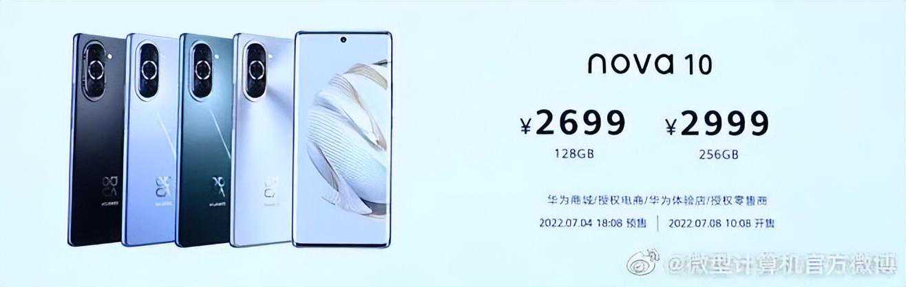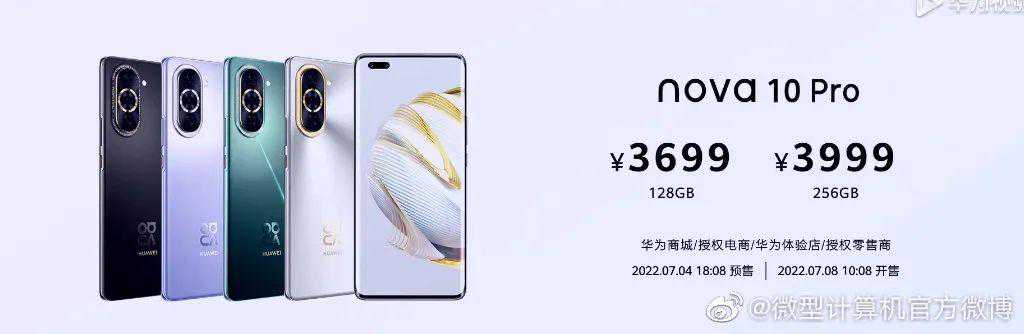 华为nova10系列将于2022年7月8日10:08正式开售,共有“10号色”“曜金黑”“普罗旺斯““绮境森林”四种颜色提供选择。其中华为nova10128G版本2699元;华为nova10256G版本2999元;华为nova10Pro128G版本3699元;华为nova10Pro256G版本3999元,敬请期待。