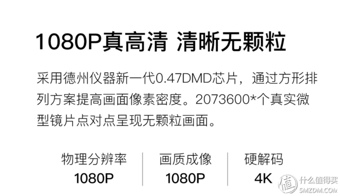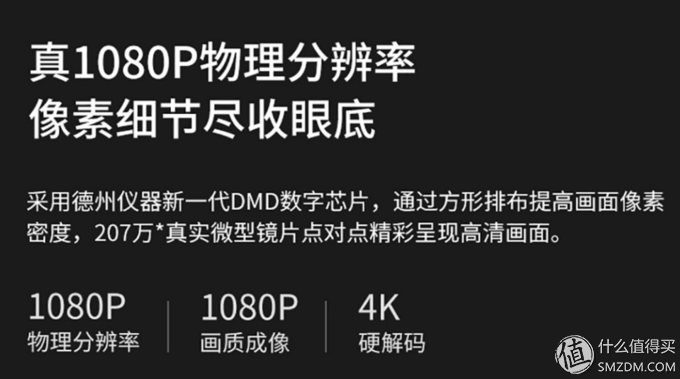 注意,这里依靠高频率抖动出来的分辨率并非虚的,而是依靠人眼的“视觉停留”效果达到了真正提升分辨率的方式。上图为德州仪器官网截图,在微镜列阵尺寸(Micromirrorarraysize)标明1080P的情况下,这枚DLP470TE芯片的实际显示分辨率可达4K。其该技术的出现大大降低了相关产业的成本,家用投影就是其中深受影响的产业之一。