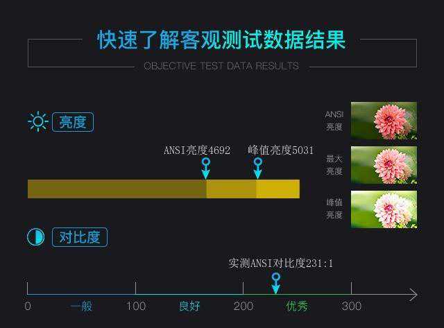 测试显示长虹P6F的亮度ANSI亮度达到了4692流明,峰值亮度为5031流明,超过了标称值。这样的亮度足以支撑它投射100英寸乃至更大的画面尺寸。同时其ANSI对比度也达到了231:1的水平。ANSI对比度是多个点的黑色和白色画面对比,超过200:1就是优秀的水准。