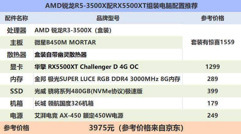 推荐方案点评:这套平台选用了物理六核的三代锐龙R5-3500X配高性价比RX5500XT游戏显卡,在销量王微星B450MMORTAR迫击炮主板支援下组建的一套全固态主流3A轻游型战斗平台,主机预算完美控制在四千元以内,性能完全能和对手的i5-9400F配GTX1650Super打个棋逢对手!相信我,这套3A平台在1080P分辨率下流畅各类中大型游戏,没有任何问题的。