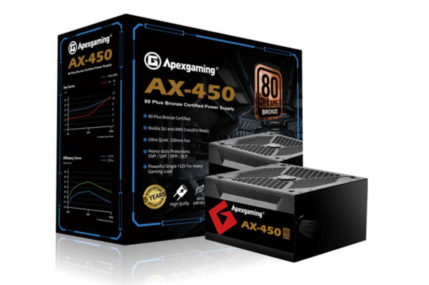电源推荐的是美商艾湃电竞AX-450额定450W电源,轻松通过80PLUS铜牌认证,主动式PFC+双管正激电路设计,宽幅电压,单路12V输出,5年免忧质保。