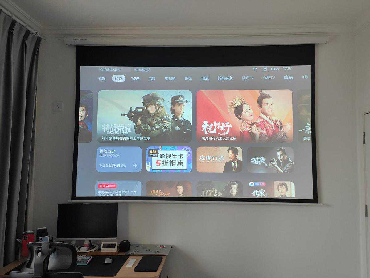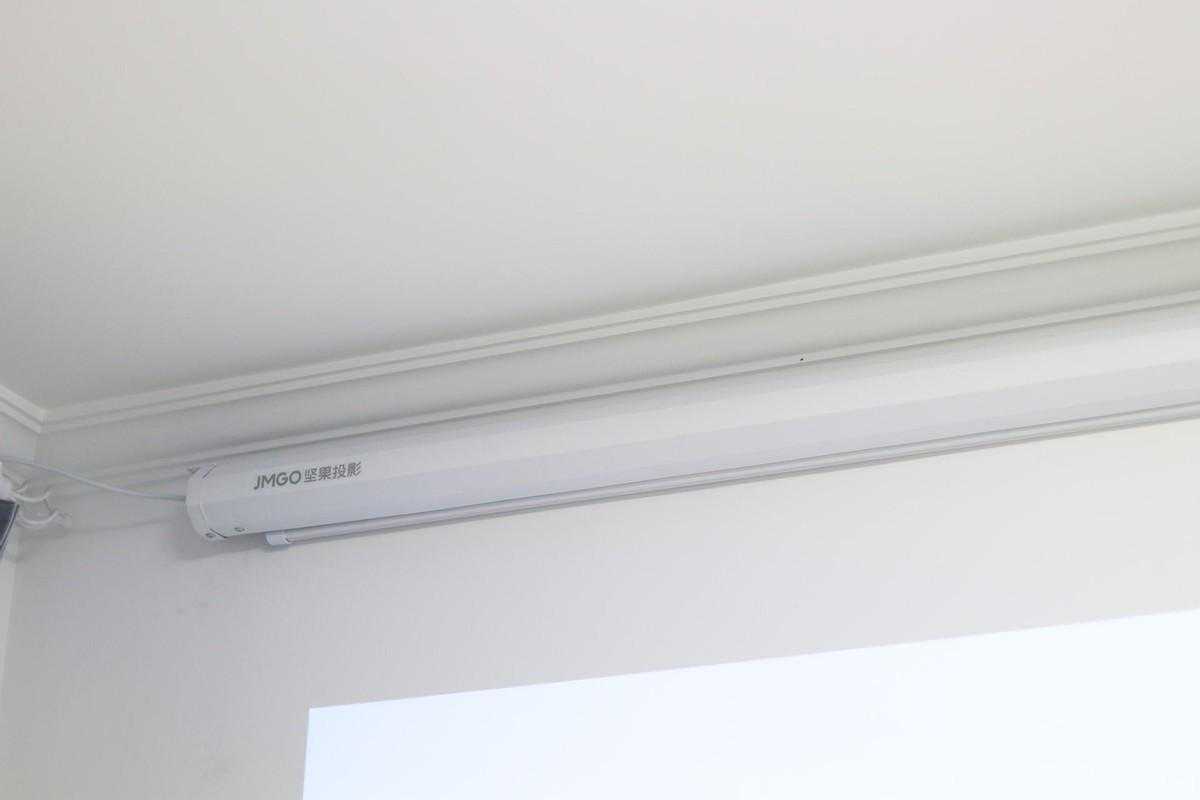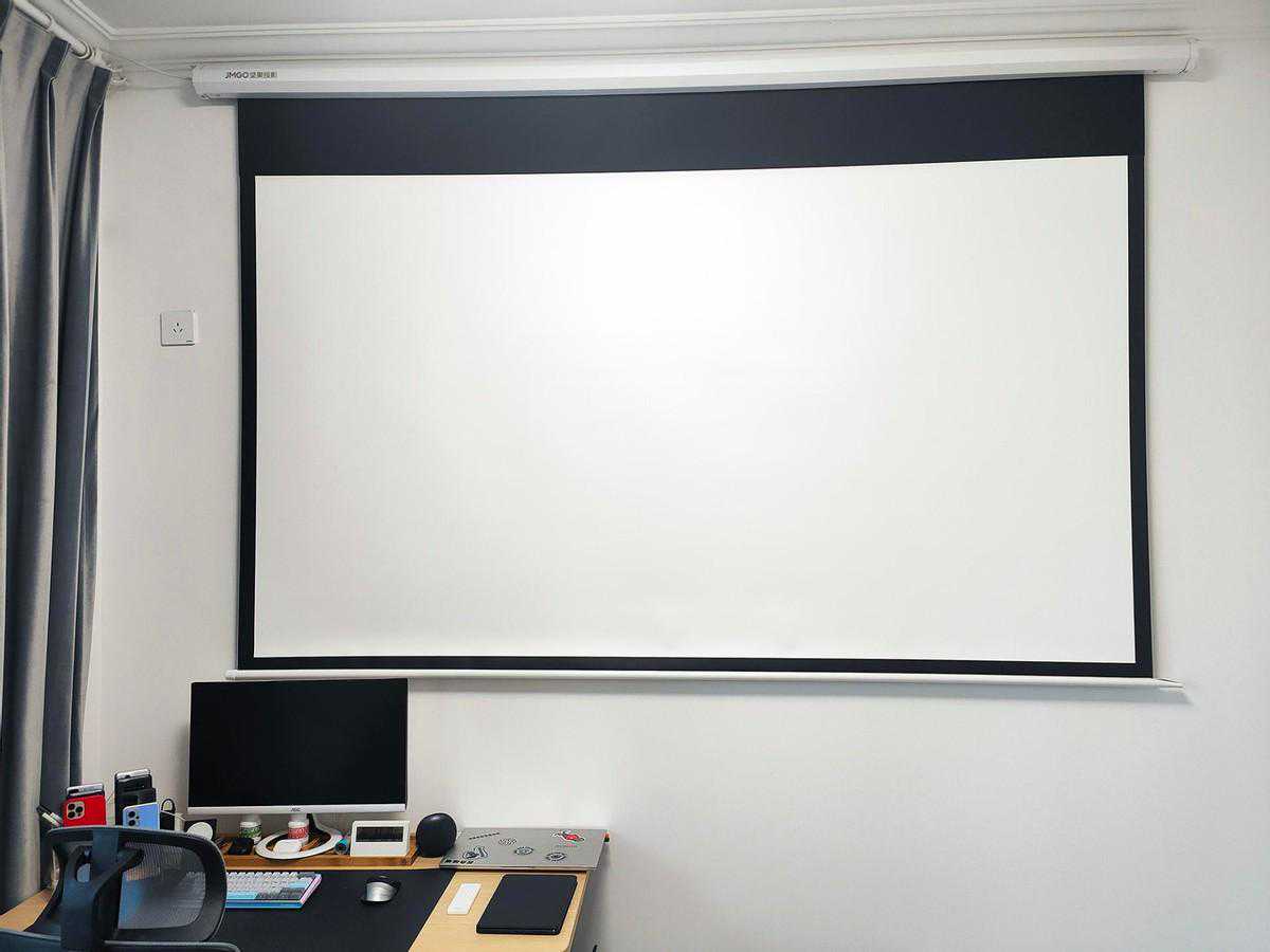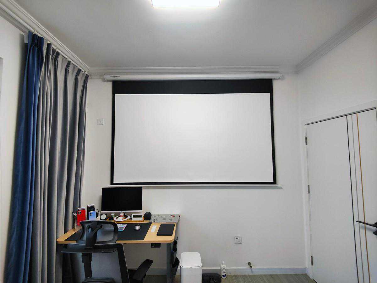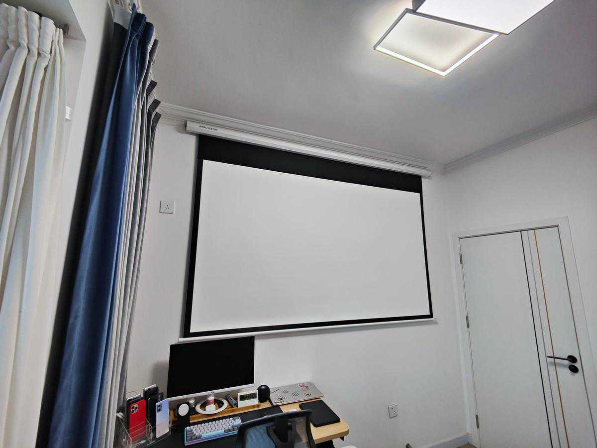 最终我还是决定装电动升降幕布,因为这面墙我每天都要面对,如果平常不看投影的时候也有块屏幕在上面,确实有点影响。升降幕布就可以解决我的问题,不看的时候就升到最上面,基本上不会影响。所以如果你跟我一样,想要让投影效果更好,但平常又不希望一个屏幕在面前碍眼,最好就是选升降幕布。要是你家还在装修阶段,那完全可以在吊顶里预留一个开槽,升上去之后实现完美隐藏。