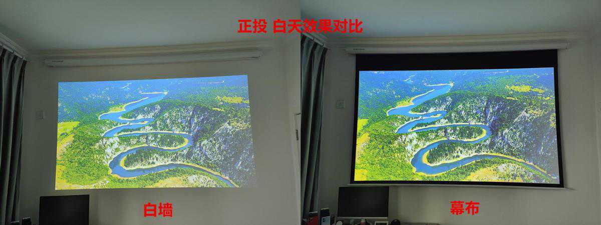 左边是白天不拉窗帘,然后直接投射在白墙上,可以看到整个画面其实还是相当不错的,毕竟坚果J10S的硬件素质在这,如果没有对比的话,大部分人肯定会觉得投白墙已经够好了。但相比右边用的幕布的效果,就看得出来直接投向白墙的话对比度明显低了。