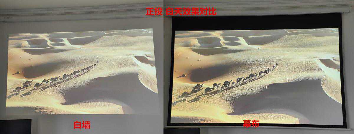 第二个对比场景是一个沙漠,这种颜色相对来说没那么艳丽的场景,其实最考验幕布增益效果。白墙上的画面就有点发白发虚,但有了幕布之后,画面通透感也有明显的提升。沙漠的肌理效果也看起来更清晰。