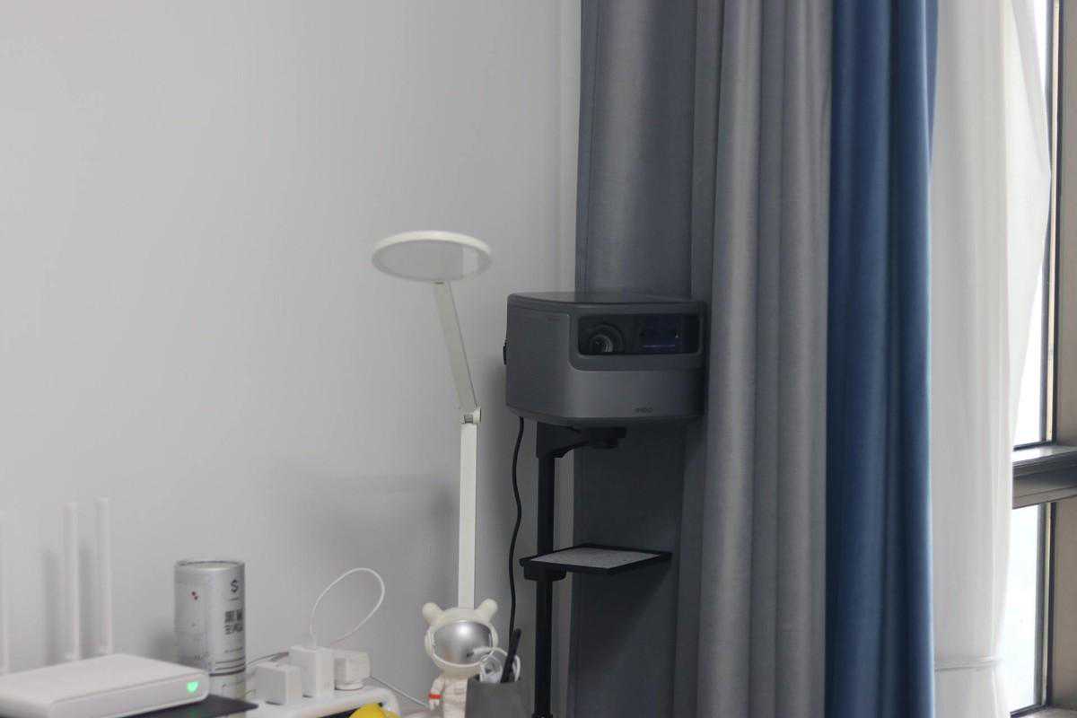 这块幕布是支持侧投的,所以投影的摆放位置就能比较随意了,不一定必须要正对着屏幕,你也可以放在角落里面。我就把它放在了窗帘旁边,然后斜着投射在幕布上。