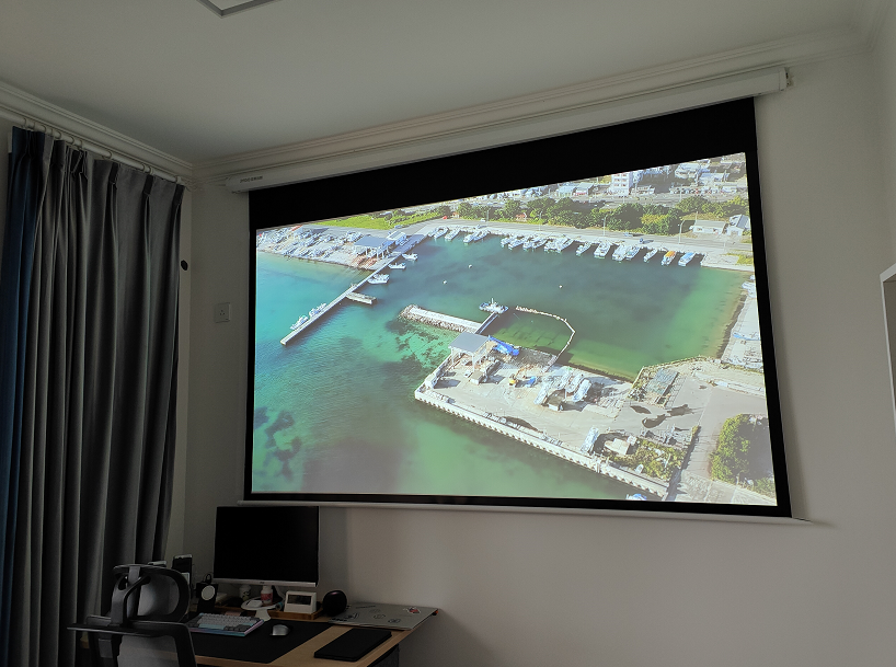 这台幕布的整个升降体验很顺滑,也没有卷边、翘边、褶皱的情况,相比于白墙来说,确实是有提升的。而且侧投效果也可以,加上120°的可视角度,不亏。另外要说明的一点就是,如果是全黑环境下投射对比,那投白墙和投幕布差别很小,但如果是有环境光影响,那有幕布加持真的会好不少。当然,如果你家墙面不是白色,那就必须要幕布了,不然偏色会很严重。