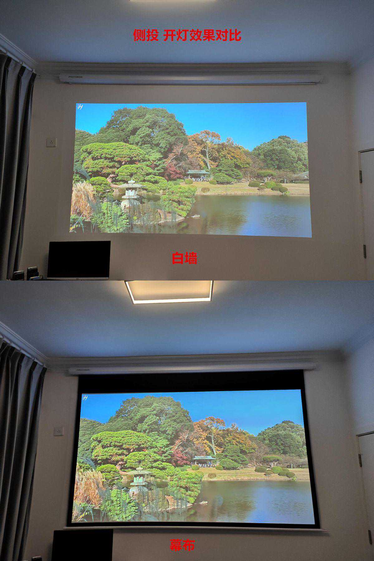 侧投情况下,打开吸顶灯之后可以降低灰边情况,所以侧投的时候我比较喜欢开一个低亮度辅助灯。不过开灯之后对画面亮度影响还是有的,好在,幕布同样带来了对比度提升,减弱了灯光带来的损失。可以看到,左侧植物,本该是通透翠绿的叶子,在直接投白墙的情况下已经明显泛白出现灰蒙蒙的情况。另外,和有幕布对比起来,蓝天的颜色也不正,甚至有点偏青色了。