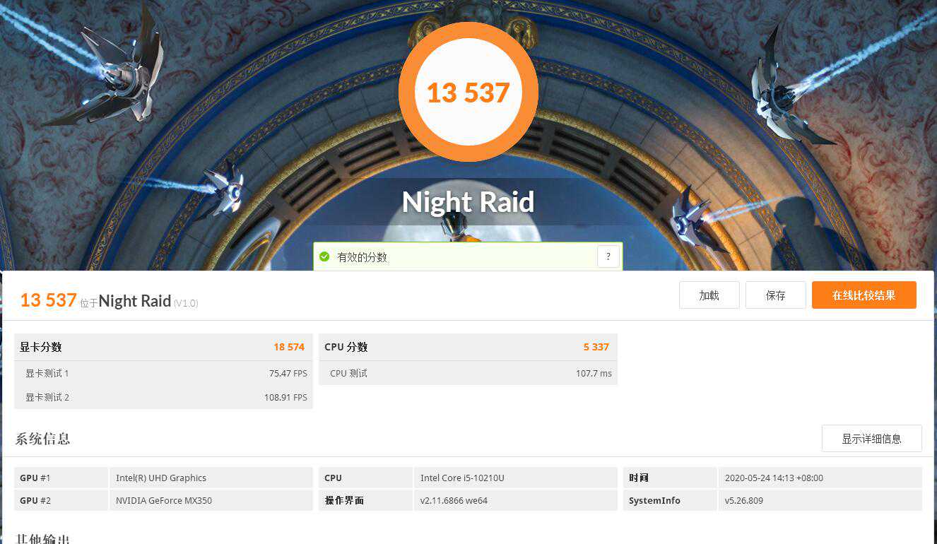 3DMARKNightRaid测试中荣耀MagicBookPro2020取得了13537分的成绩,相较于上一代MX250,这一次的MX350在性能上的提升相当显著,理论上MX350在性能上依然有着20%左右的提升。