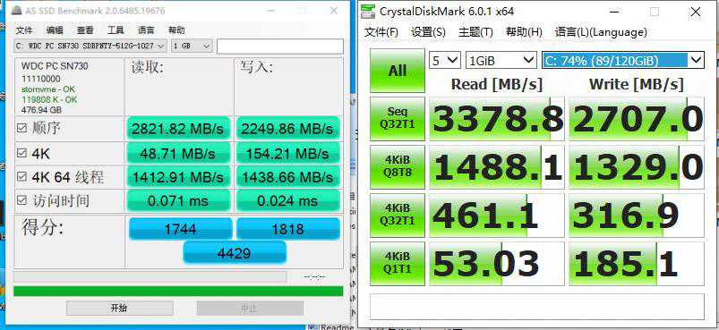 荣耀MagicBookPro2020内置一块512GB西数SN730固态硬盘,在ASSSDBenchmark中,顺序读写分别达到了2821.82MB/s、2249.86MB/s的速度,4K随机读写分别达到了48.71MB/s和154.21MB/s。CrystalDiskMark中,顺序读写速度分别为3378.8MB/s、2707MB/s,4K随机读写53.03MB/s,185.1MB/s。平时传输文件拷贝电影音乐肯定是足够满足了,不过论文件传输效率如何,荣耀MagicBookPro2020其实还有“秘技”,这个后面笔者再给大家分享。