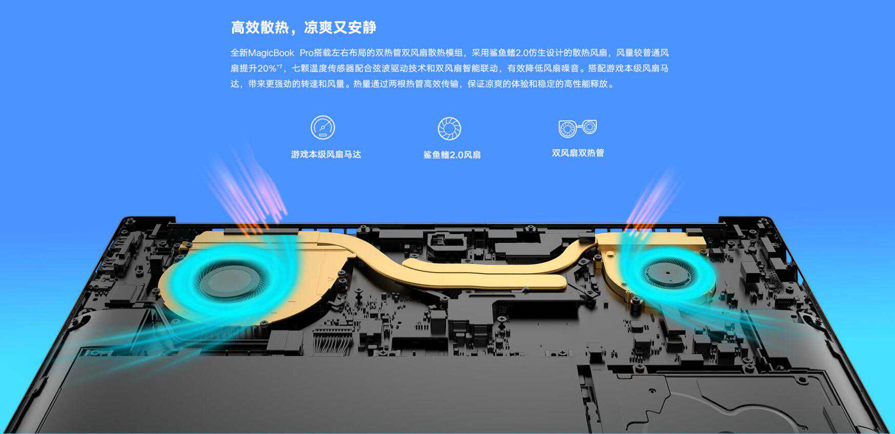 笔记本性能表现往往与散热情况有着密不可分的联系,运行高温导致处理器降频就会使得性能下降。而长期高温也会对笔记本内部元器件加速老化,荣耀MagicBookPro2020内置鲨鱼鳍双风扇*2.0版本,风扇扇叶采用仿鲨鱼鳍设计,从底部四面吸风有效提升风扇转速。笔记本产生的热量通过热导管高效传输释放。