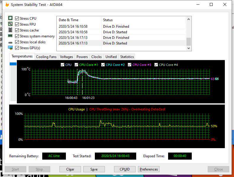 在AIDA64的20分钟系统稳定性测试中,可以看到只有在测试开始时CPU温度有明显的一个升高过程。但是随着时间推移荣耀MagicBookPro2020内置鲨鱼鳍双风扇散热系统开始工作,CPU温度很快降了下来,并且长达20分钟的测试过程中一直都将温度稳定的控制着。