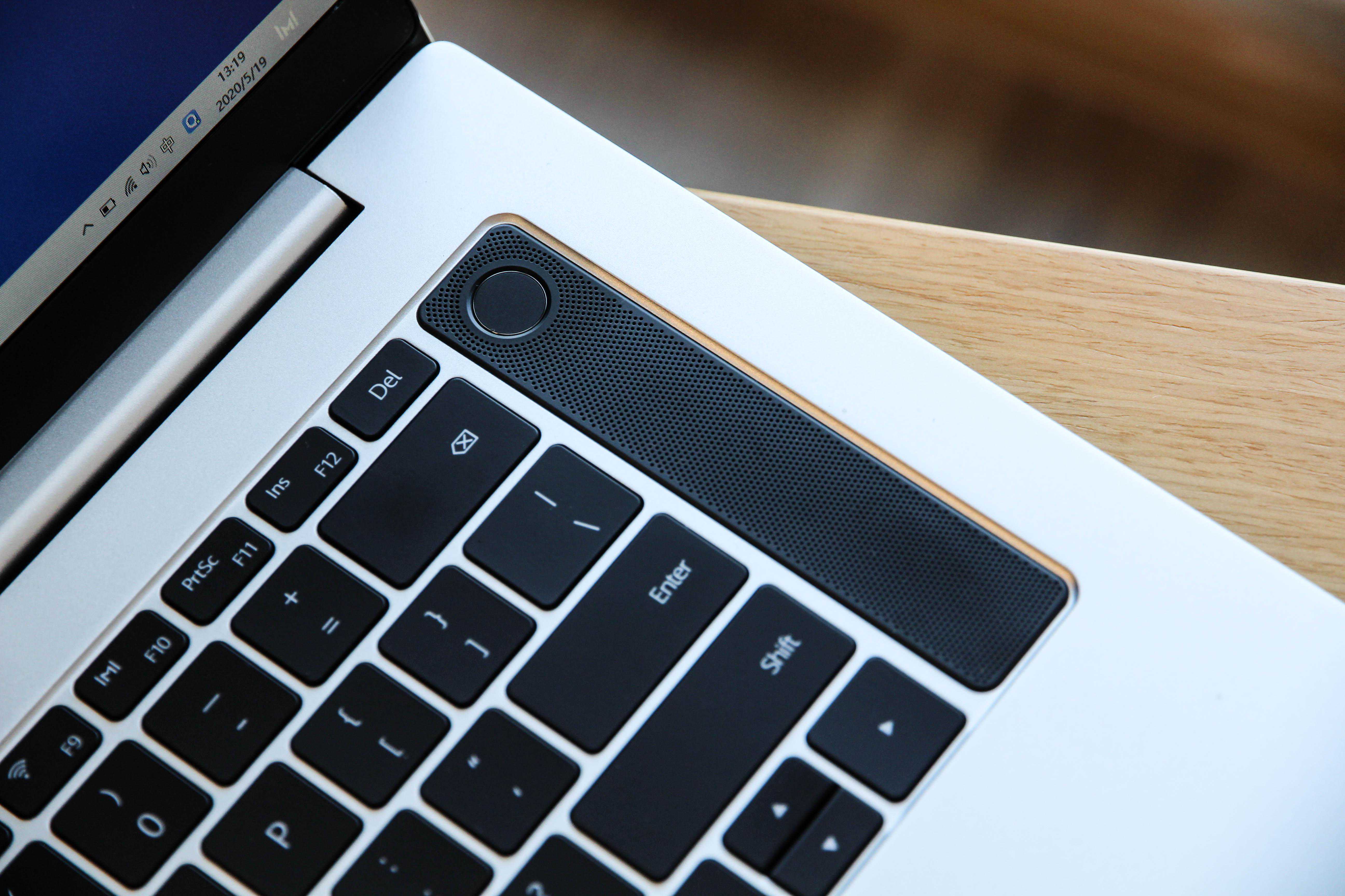 荣耀MagicBookPro2020的外放喇叭设计在了C面键盘区域两侧,不在底部没有遮挡外放效果自然不言而喻。荣耀MagicBookPro2020的开机电源键与指纹识别组合在了一起,我们按压电源键启动时,指纹信息就已经被缓存进行身份识别,不需要等待登陆界面去输入密码或者扫描指纹。