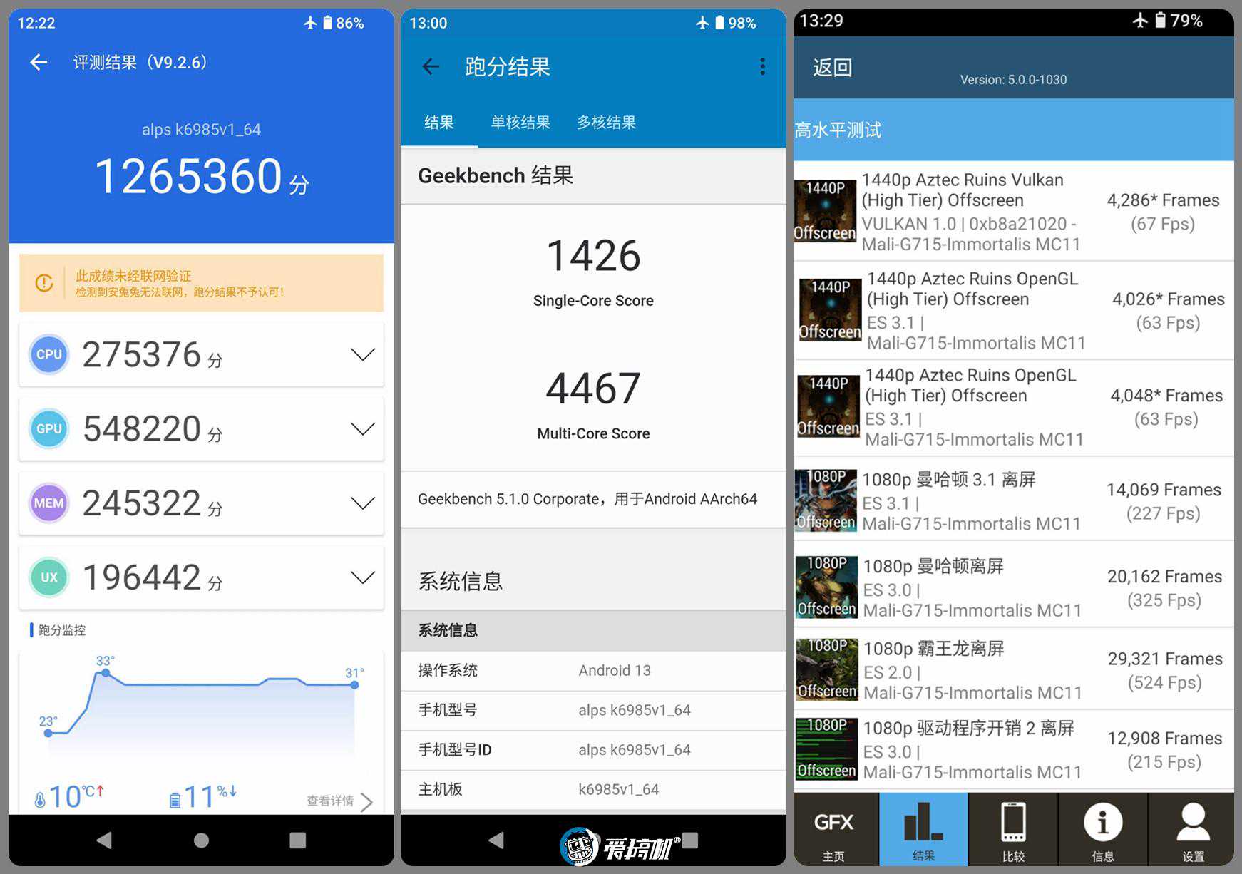 GPU这边,Immortalis-G715MC11@981MHz的核心数量和频率,都在天玑9000的Mali-G710MP10@850MHz之上。上面测试也能看到,即便关闭性能模式,天玑9200的性能损失也只有2%到8%之间,输出远比预想中稳定。