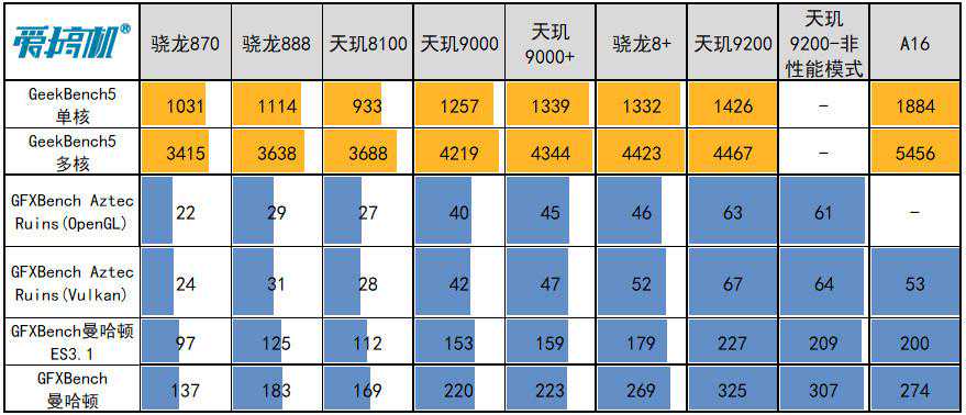 CPU和GPU部分,我们找来天玑9000/9000+、骁龙8+/888/870、A16做性能对比。
