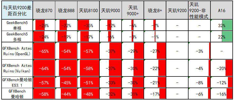 各个SoC与天玑9200的差距百分比(天玑9200领先幅度)↑
