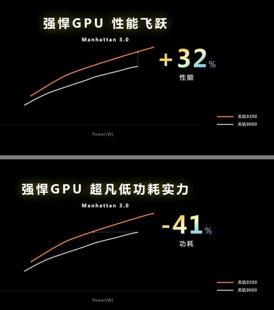 天玑9200的GPU能耗比提升,远比峰值性能提升的收益明显,它现在能跑在更低的频率,以更低的功耗运行,把机身有限的热承载(主流手机机身一般是6-7W)留给CPU,让CPU用更高的频率运行。
