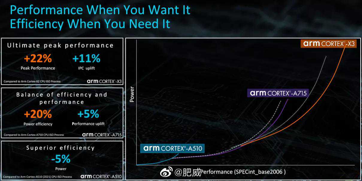 arm的PPT虽然没有提及X3具体的能耗比提升,但从官方的代际能耗比曲线看,X3的曲线反而最陡峭(同性能下能省更多功耗)。而同性能能效提升20%的A715,同样定在了和以前一样的频率。