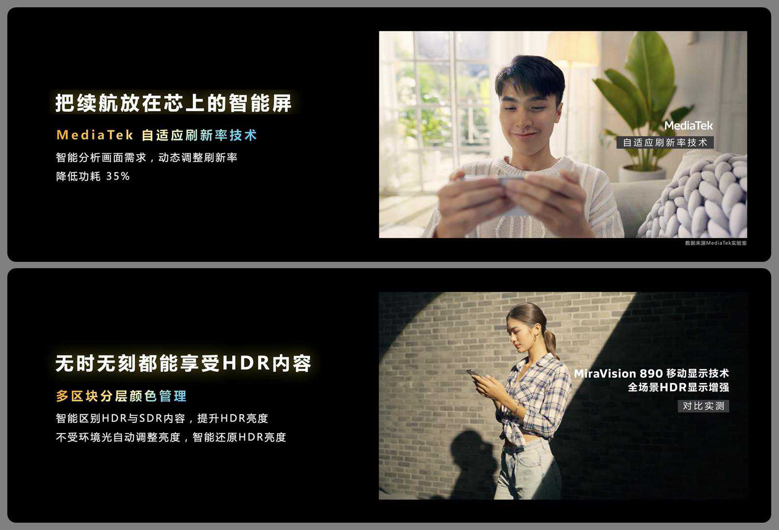 同样是MiraVision890,天玑9200自带了HDR多区块分层颜色管理。现在只有华为、vivo的旗舰有类似iPhone的多区块HDR管理(例如相册中把系统和照片分开做HDR管理,利用屏幕的亮度余量做HDR,让亮的地方更亮),而且走是都是软件方案。
