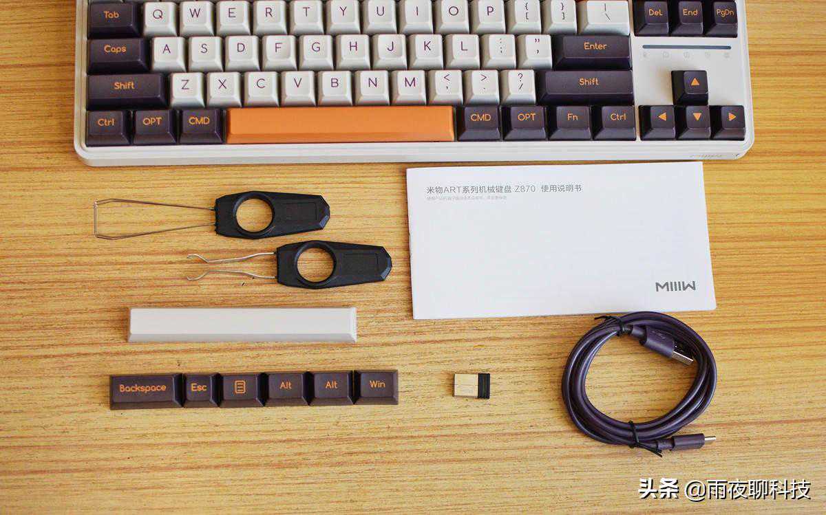 除了一般键盘标配的电源线、接收器、说明书外,这款米物Z870还专门配备了一只拔键器、一只拔轴器,同时因为这款键盘支持了IOS系统的MAC以及WIN系统电脑,所以连可替换的标准键帽,也都一应俱全。