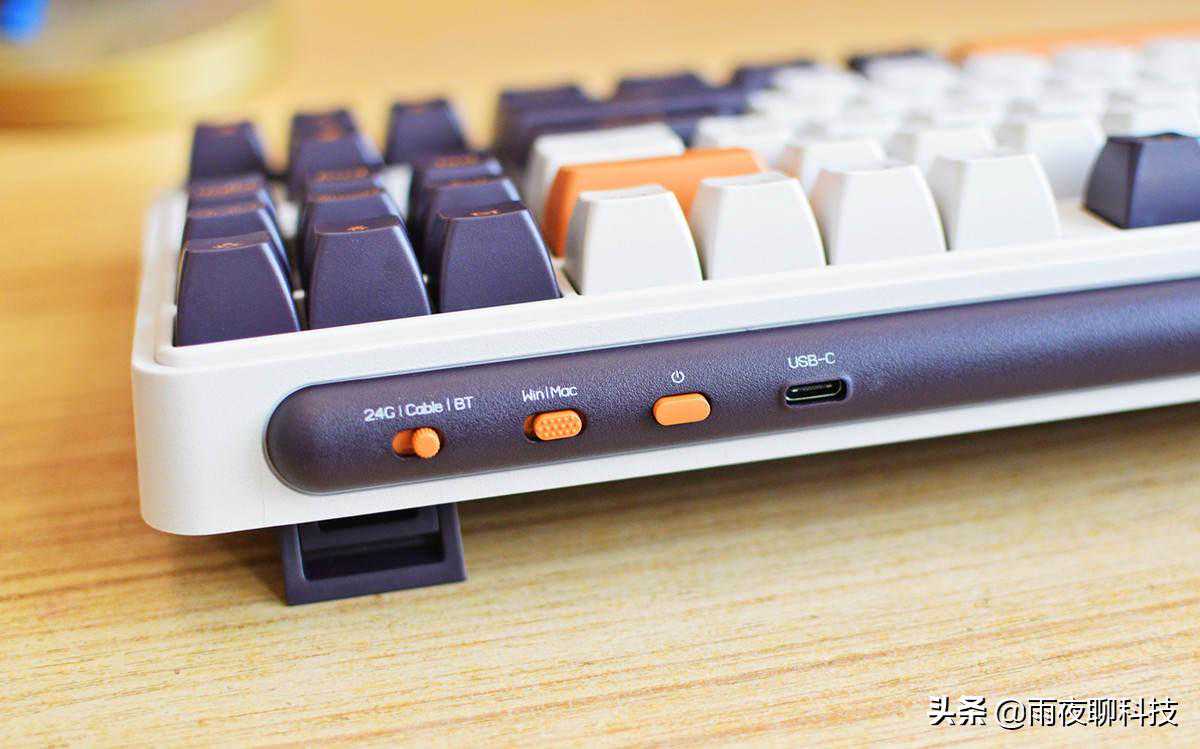 米物Z870的后侧,有四个应用区:下图从左至右分别是:1、模式调整键(支持无线、有线、蓝牙三种模式);2、WIN/MAC操作系统切换键;3、电源开关;4、Type-C充电口