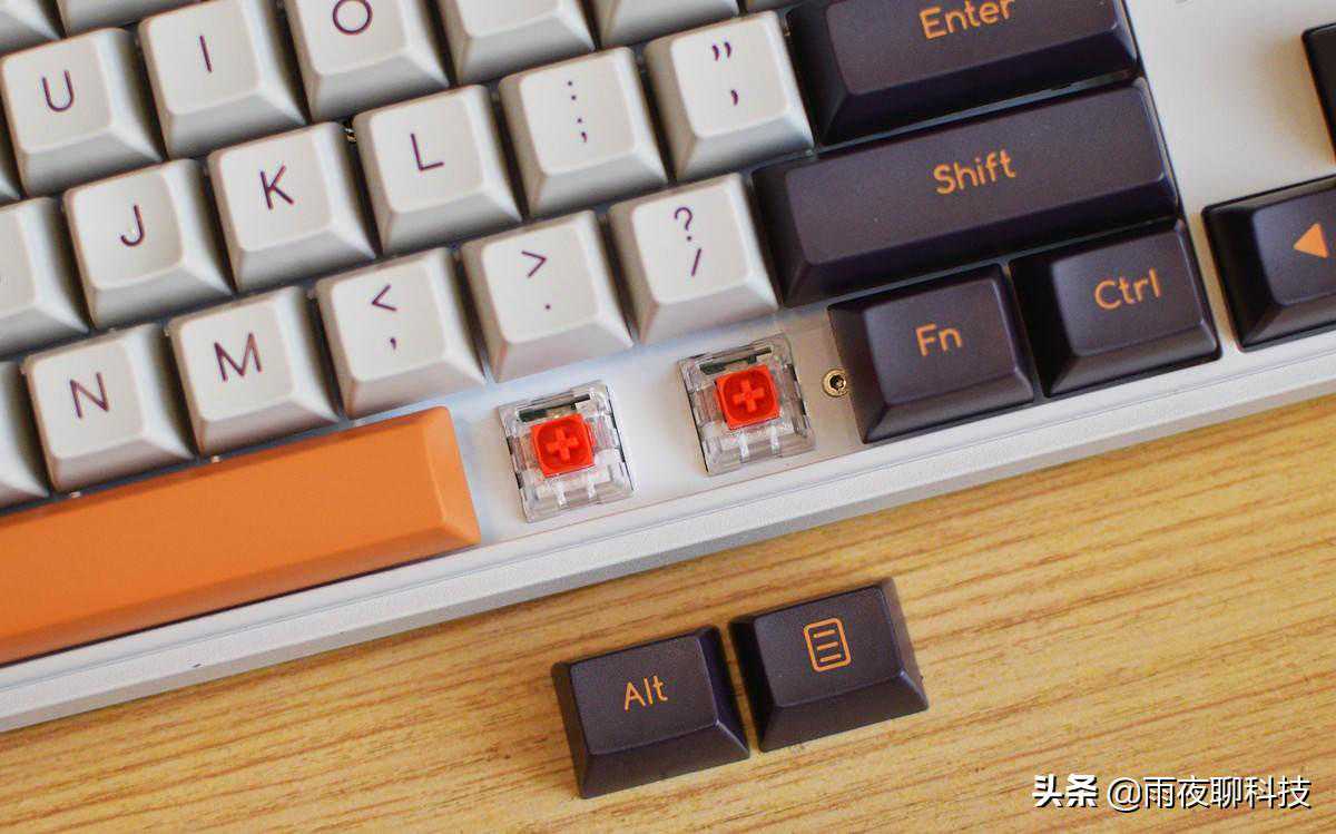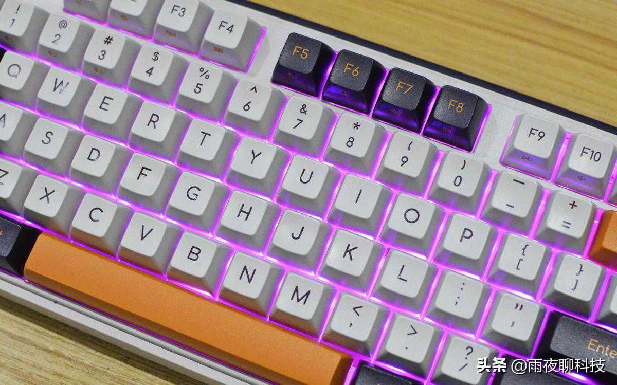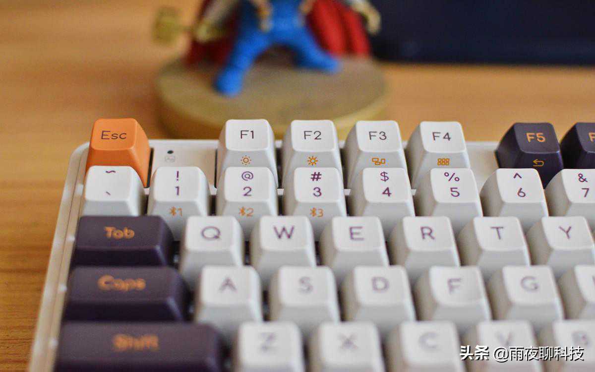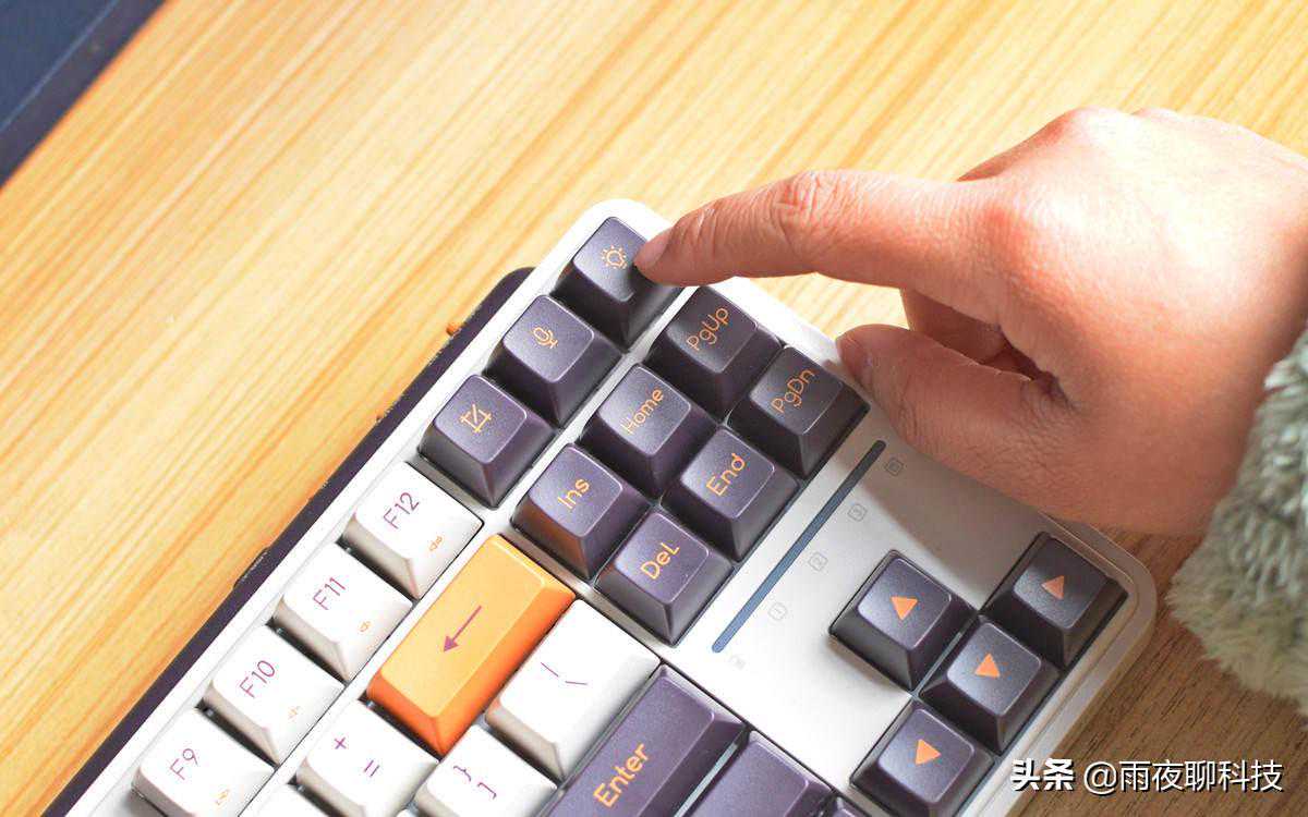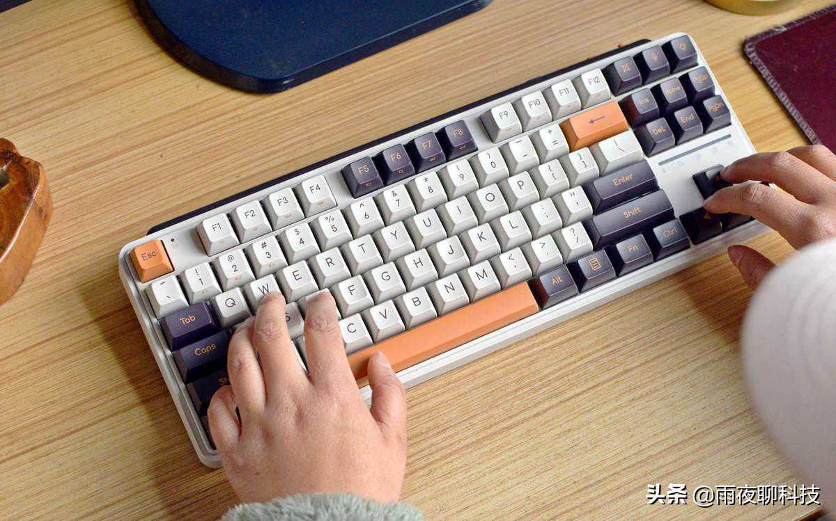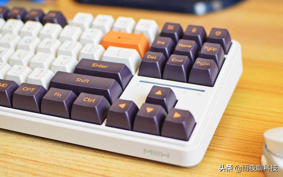 小编手上这款Z870机械键盘,是紫薯牛奶款,主键位采用白、紫、橙三色搭配,看上去非常醒目。出厂标配了MAC电脑专属的CPT和CMD键位,如果是使用WIN系统的电脑,可以自己进行更换。