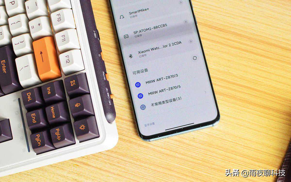 下面我们来尝试一下使用蓝牙连接:小编手上没有MAC,所以暂时就用我的米10S试一下效果吧,将米物Z870键盘拨至中间档(蓝牙),打开手机蓝牙,此时手机蓝牙就能发现MIIIWART-Z870/3及Z870/5的蓝牙字样,选择一个蓝牙,就像连接蓝牙耳机一样简单。