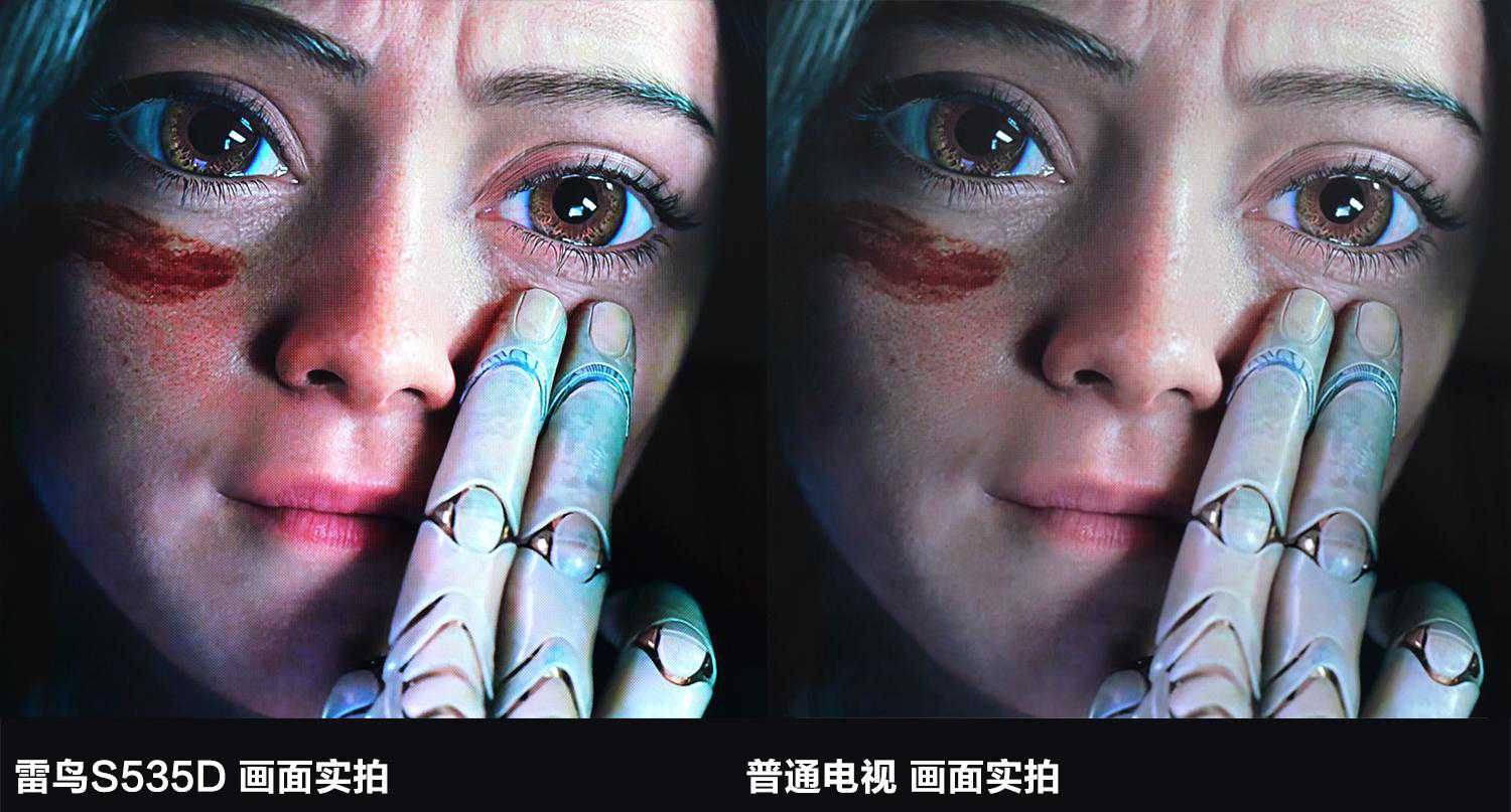 举个例子,图中是我家这台雷鸟S535D和一台普通电视,播放的4K分辨率电影画面。阿丽塔鼻周区域的对比特别明显,用S535D可以清晰的看到更多色彩和细节。