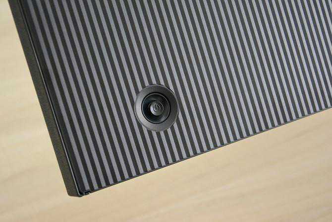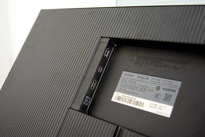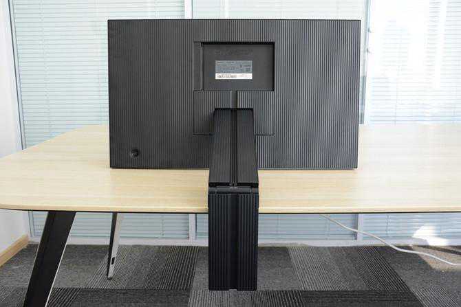 显示器的背面同样平整没有弧度,黑色具有立体感的竖纹,视觉和手感都相当不错。中间的凹槽是线缆连接处,下面是支架的固定处,并通过一个盖板将连接处隐藏,让整个背面更加一体化。