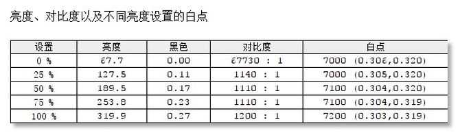 下面的测试为亮度、对比度以及不同亮度设置的白点,本测试项目主要测试显示器的色温。需要说明的,这款27英寸的三星SpaceMonitor显示器可以自定义色彩色温,除了默认的标准,还有多种可选。这里我们采用的是默认标准设置。