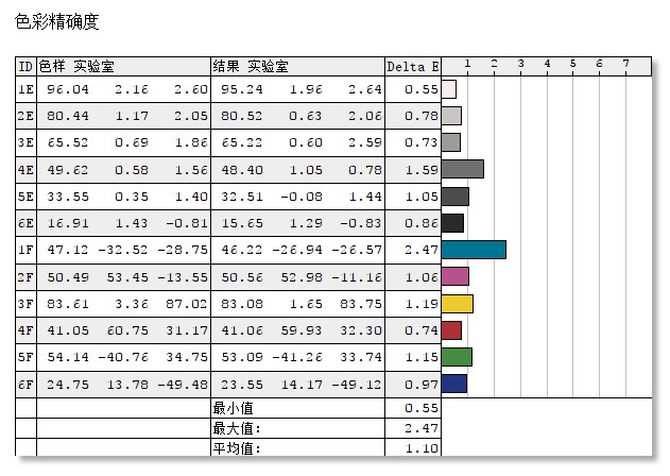 色彩精准度测试通常而言是衡量一款显示器在光照环境下,精确反应显示器色彩表现准确性的指标。通过下图的数据可以看到其最小值为0.55,最大值为2.45,平均值为1.10,这个数据的结果相当出色。