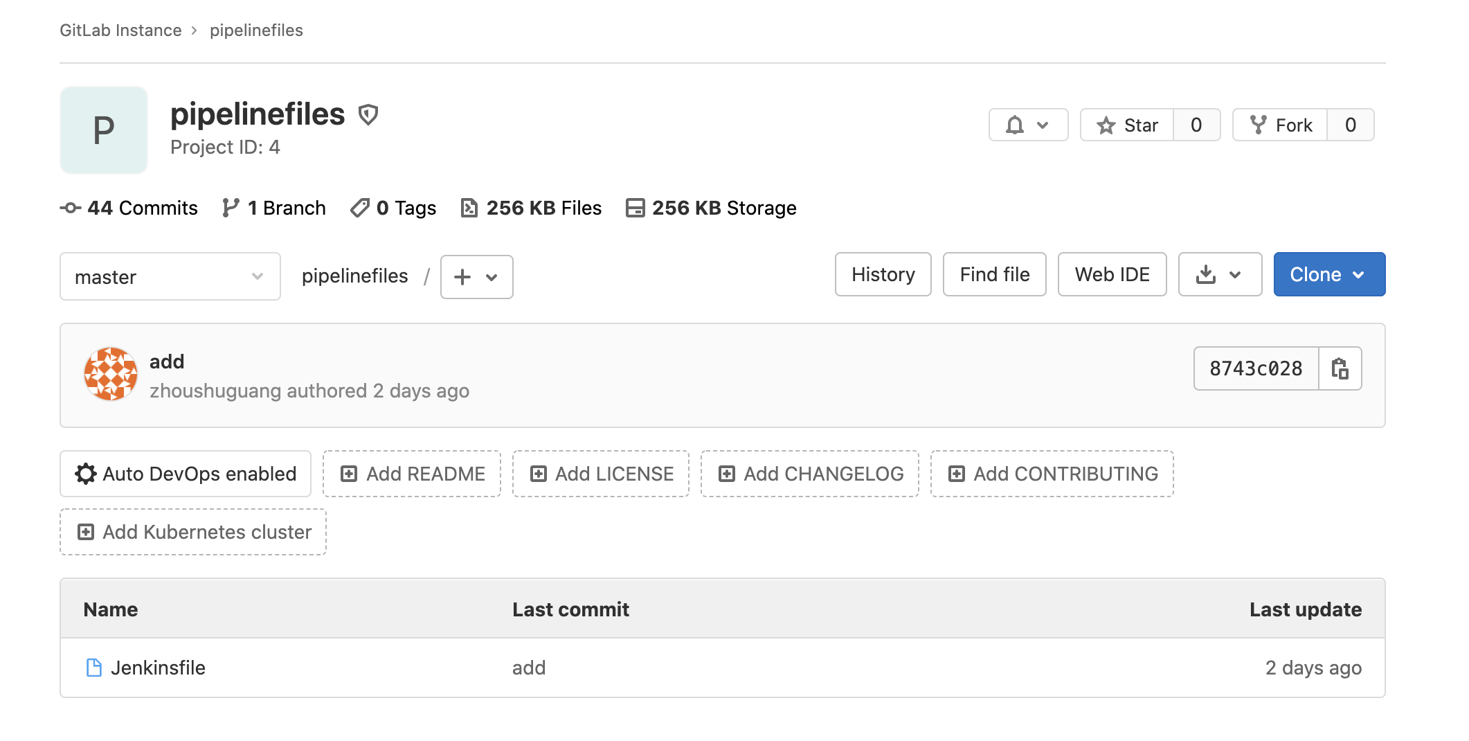 然后在我们的gitlab中新建一个项目,只需要一个Jenkinsfile文件