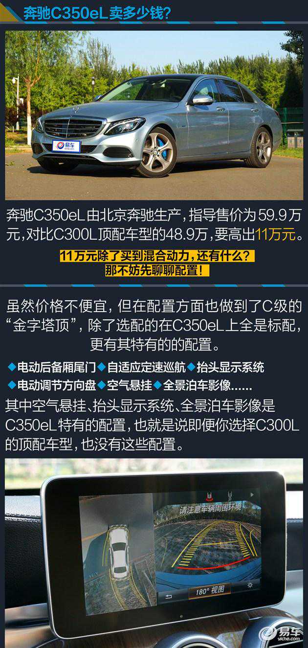 今天我们的主角是奔驰C350eL,同样是一款插电式混合动力车型,但注意不同于S500eL的进口身份,它由北京奔驰生产,指导售价为59.9万元,对比C300L顶配车型的48.9万元,要高出11万元。不过这多出的价格除了买到混动的驱动方式外,还有即便C300L顶配车型也没标配的空气悬挂、电动后备厢尾门、抬头显示系统、自适应定速巡航、全景泊车影像这些配置,综合配置来看,奔驰C350eL的定价也算是合情合理。