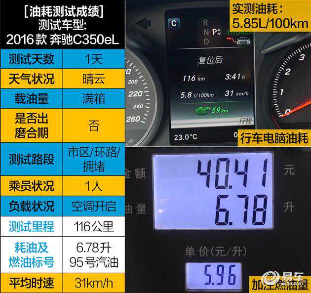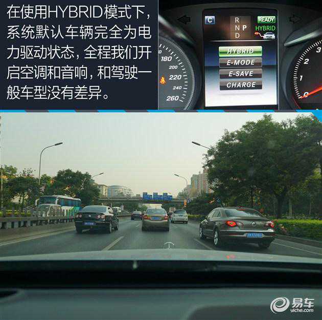 说实话这和我们想象中的油耗成绩有很大差异,和厂家公布的2.8升/100km也有很大出处。因此我们又进行了一次油耗测试,但方法略有不同,前面部分没有差异,同样是在电池充足的情况下开始测试,车辆约19km后发动机开始强制介入。但在后面的环节中我们尽量的选择CHARGE模式,也就是更多的情况下为车辆充电,例如在高速巡航时,而在电池充满后再次进入纯电力驱动模式,这样的行驶方式让C350eL的最终油耗为5.85L/100km。为什么采用这种方式?其实我们只是在车辆高速行速,发动机负荷较大时,更充分的为电池充电,以另外一种形式更大的榨取发动机动力,最终的成绩大家看到了,效果也是很有成效的。