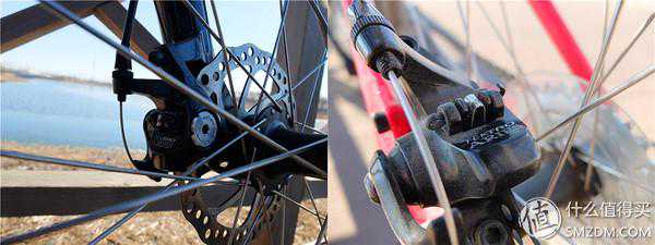 按照汽车理念,好车得是跑得快刹得住,汽车刹得住不仅仅是刹车的事情,跟轮胎的宽度以及花纹都有关系。这车的好处在于使用的东西反正都是牌子,基本在首富家都能查的到。前后都是碟刹(TektroAries碟刹),使用的也是有机的刹车片,算不上低端,应付一般的户外环境没问题。实际使用中因为我骑车的路基本都是绿道或者柏油路,沙尘也都不大刹车系统还是挺好使。