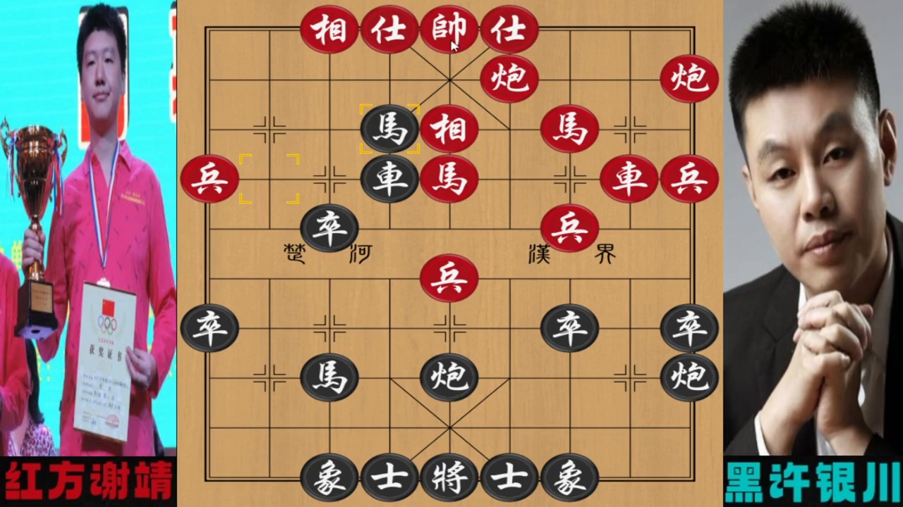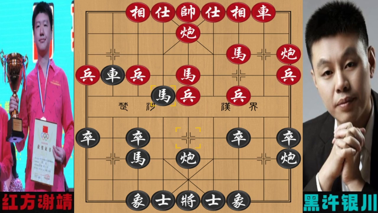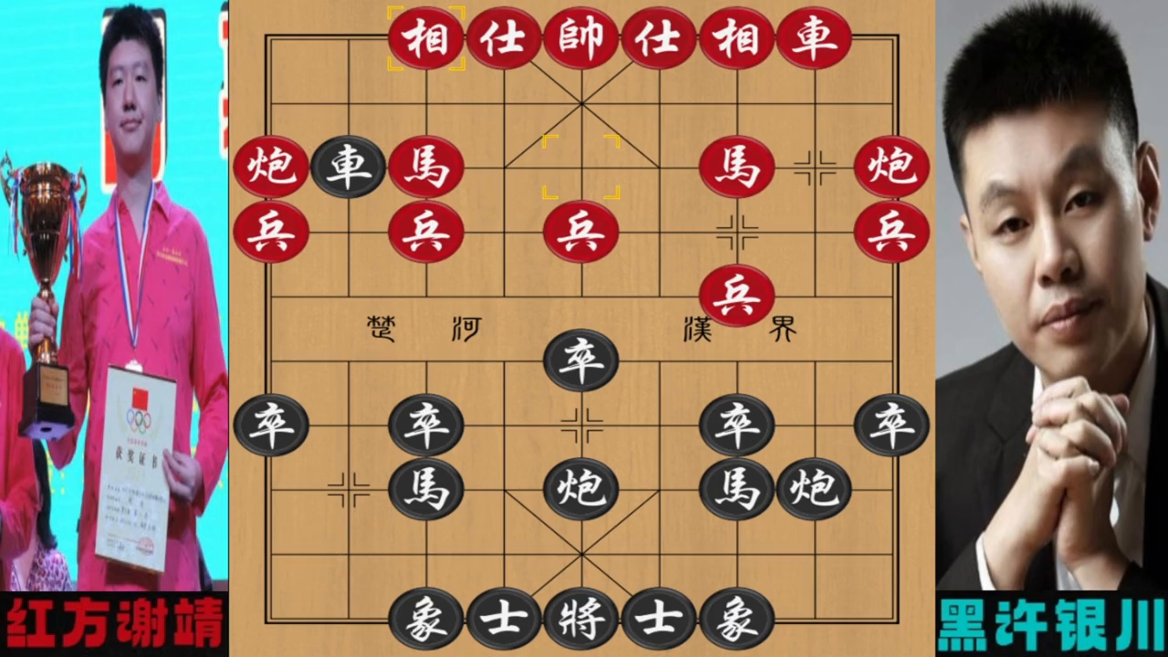双方来到了五比五平,二零二零年决定胜负的这盘棋请看大屏幕。二零二零年碧桂园杯冠军特大邀请赛,三十一岁的小司令谢敬向三进五先飞象,四十五岁的姜太公许仙许云川马二进三走了一个第一步冷屁的变化。