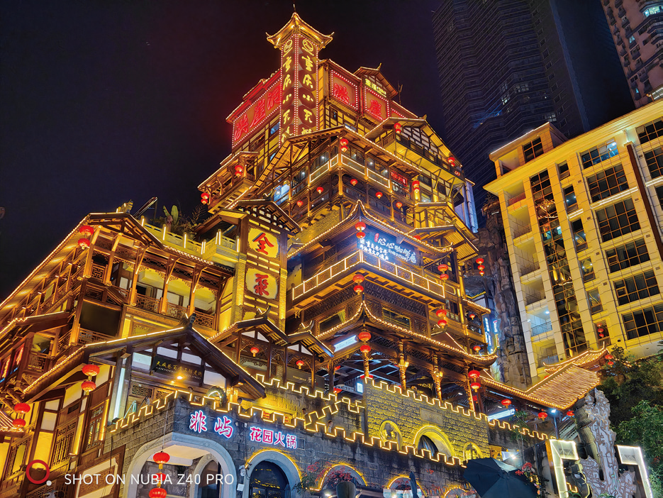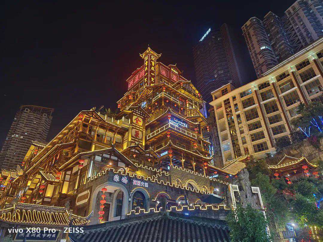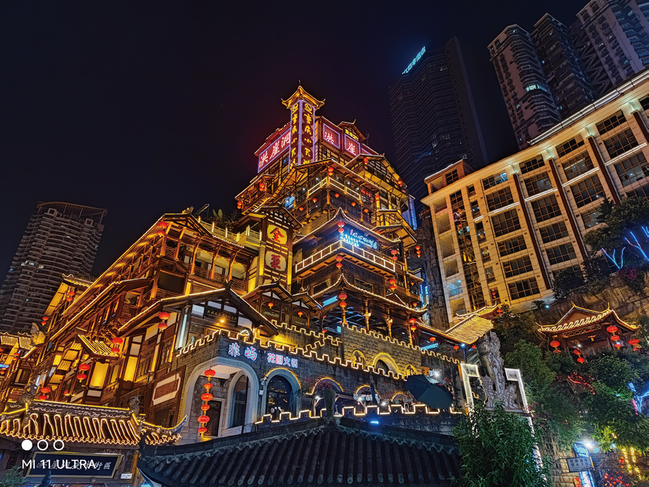 最后,终于到了夜景样张的对比环节,在这一年中,我们在太多发布会上听到了夜鹰、夜枭、夜X的算法,但到底它们的夜景表现如何呢,还是得实拍看一下。我们选择了重庆著名景点洪崖洞进行拍摄,这也是外地游客到重庆必来的景点之一。相较其他地方的夜景,复杂的木质建筑和多样的光线相当考验一款手机的拍照能力,接下来让我们看看这些手机在洪崖洞的考验下能够取得怎样的成绩吧。