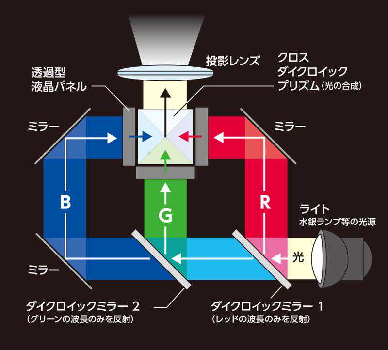 3LCD技术是用红绿蓝三块液晶板分别作为红绿蓝三基色的控制层。光源发射出来的白色光经过镜头组汇聚,而后到达分光镜,红绿蓝三色被分离出来。被分离出来的三色会分别投射到独立的液晶板上,液晶板上相应的像素接收到来自信号源的电子信号,会呈现为不同的透明度,以每个像素不同的透明度而生成了图像。最后三种单色的图像在棱镜中汇聚,再由投影镜头投射到投影幕上形成一幅全彩色图像。