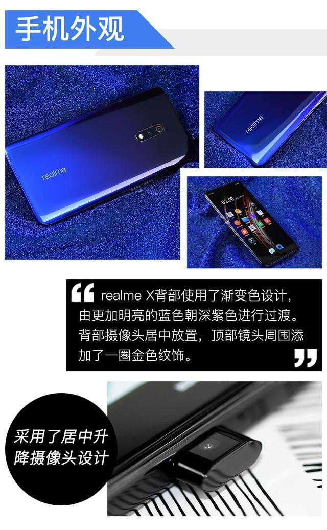 在完成去年的全面屏探索之后,今年升降式结构似乎有了下放趋势。依靠这种机械设计,realmeX在外观上取得了堪比旗舰的高屏占比效果,视觉效果更加震撼。