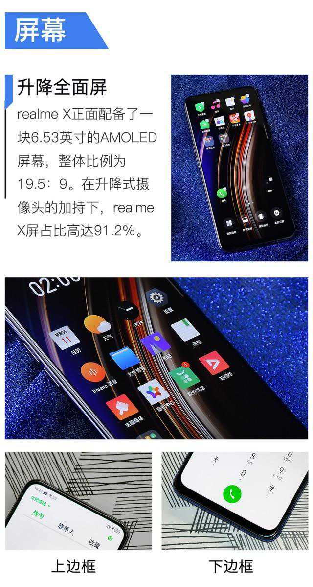 就整体外观设计而言,realmeX给人带来的惊喜主要在于正面全面屏的惊艳效果。通过升降式摄像头的加入,realmeX可以轻松实现旗舰所具有的高屏占比效果,给用户带来更加沉浸的使用体验。