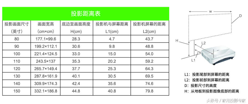 官方公布的DH765Z-UST的投影距离表