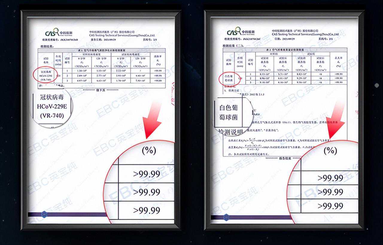 ▲从检测报告可以看出,空气环境机对冠状病毒HCoV-229E和白色葡萄球菌的杀灭率都达到了99.99%以上。
